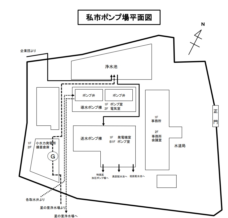 深井戸からくみ上げられた地下水は、一旦私市ポンプ場に集められ、導水ポンプで星の里浄水場に送られ、浄化してから、私市ポンプ場に返送され、大阪広域企業団水とミックスされて各配水池に送られます。