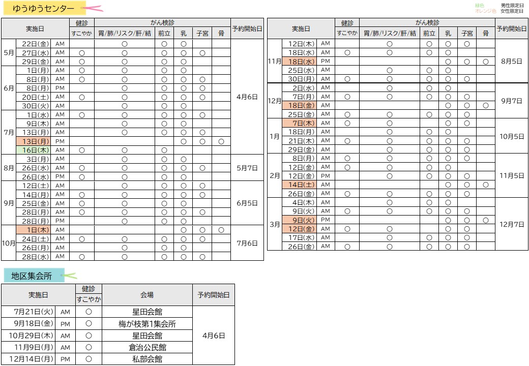 ゆうゆうセンター・地区集会所のけんしん日程・予約開始日