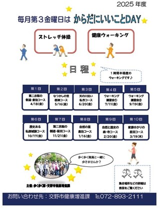 正しいウォーキングフォームや交野市内のおすすめコースを紹介しています。