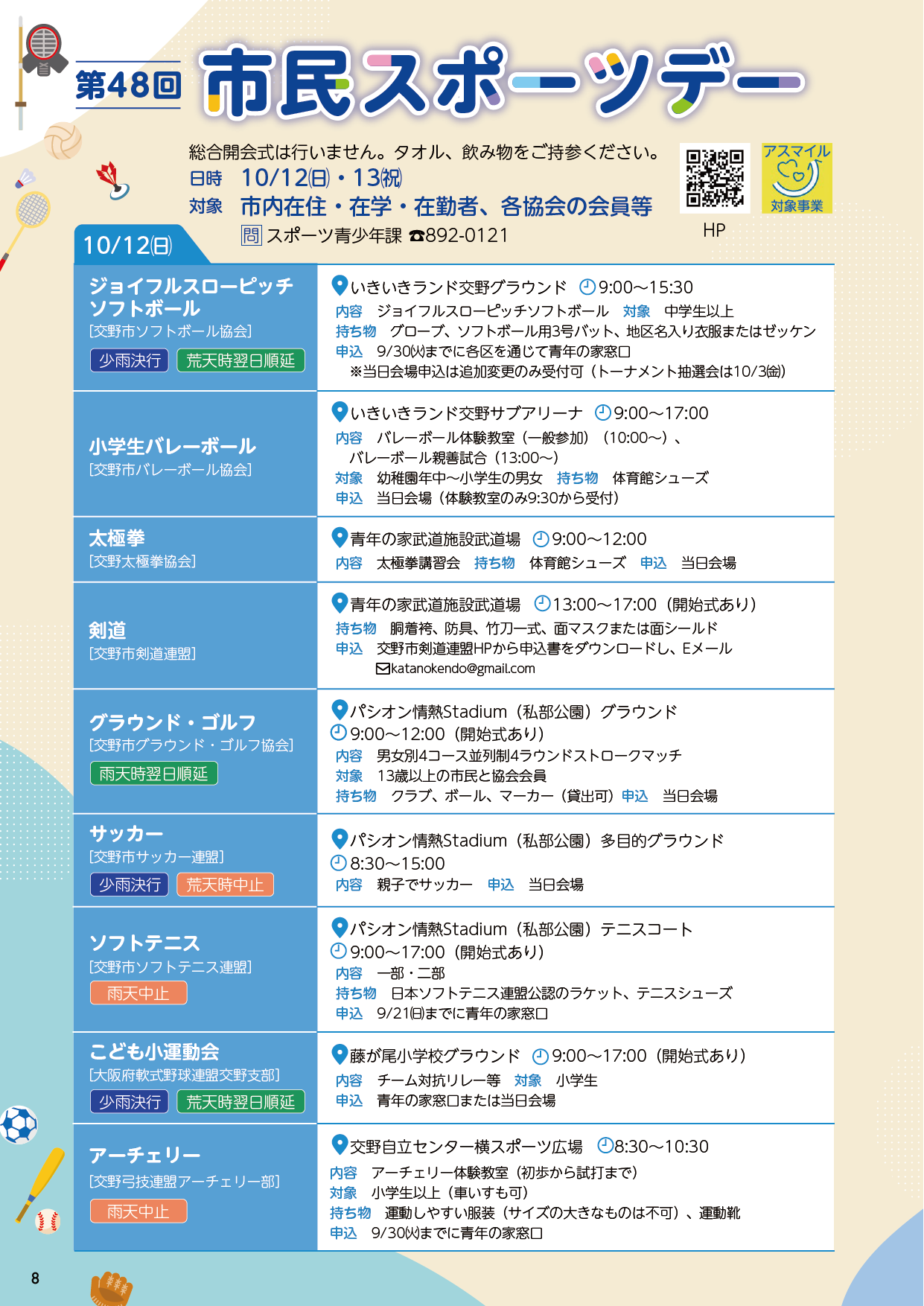 競技により、開催日時・開催会場・申込み方法が異なりますので、必ず広報かたの9月号該当ページをご確認ください。