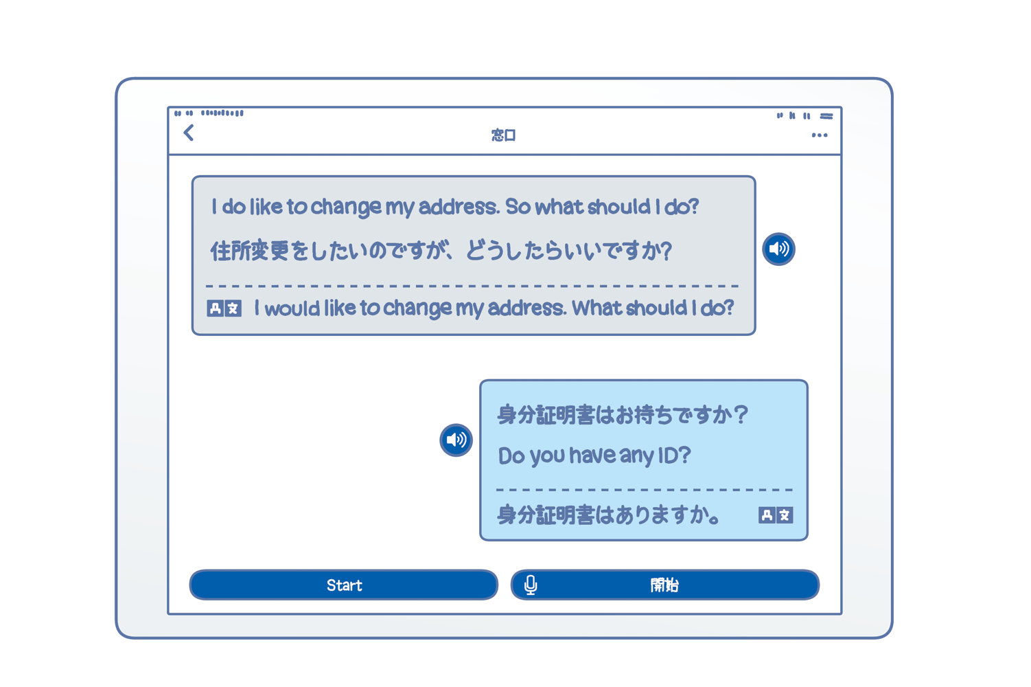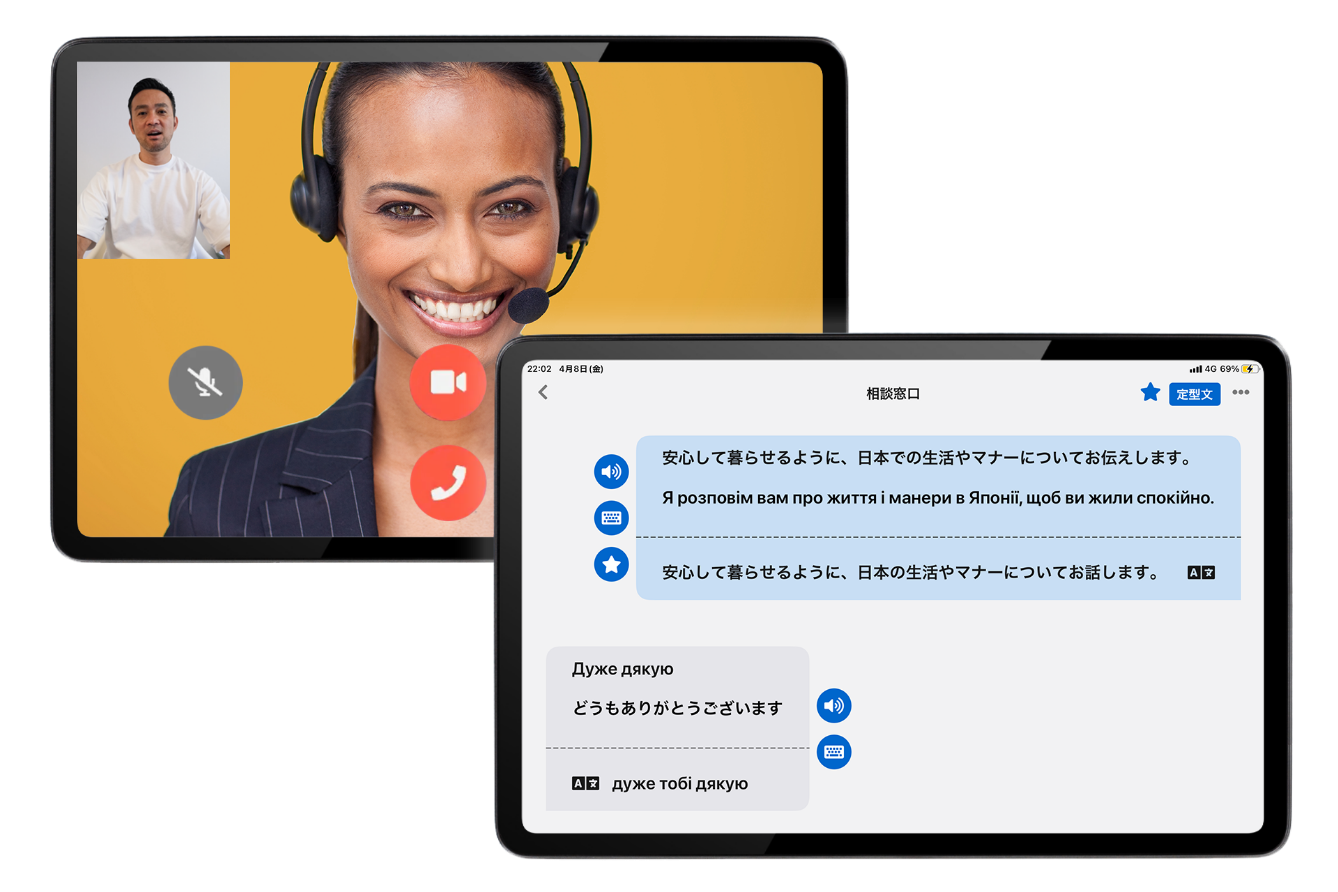 当該事業の取り組みの一環として、令和5年5月から市役所本庁、青年の家、ゆうゆうセンターに英語、中国語、韓国語、スペイン語などの31か国語の翻訳に対応した多言語音声翻訳機を導入しています。機械(AI)による通訳だけではなく、ビデオ通訳にも対応しており、ビデオ通話で直接通訳者と通話が可能ですので、しっかりとした意思疎通が可能です。外国語だけでなく、手話通訳ややさしい日本語への対応も可能ですので、必要な方はお申し出ください。