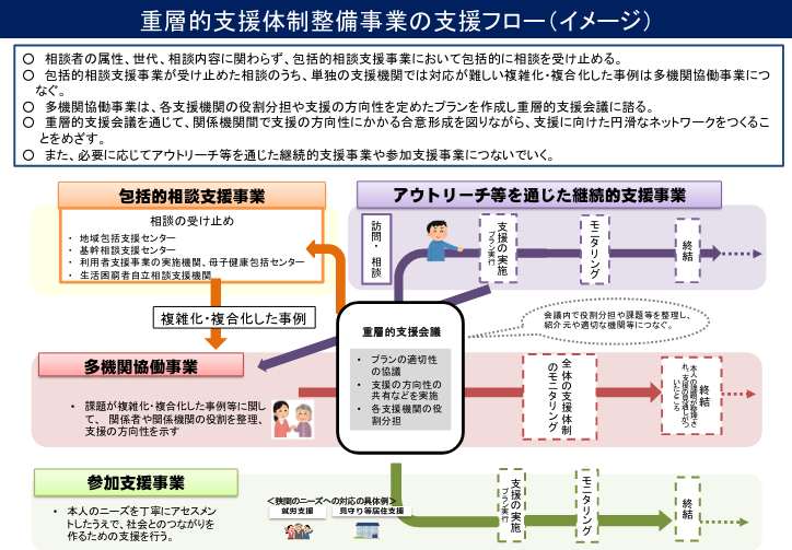 ひきこもりや8050問題(80代の親が50代の子どもの生活を支えるために経済的にも精神的にも強い負担を請け負うという社会問題のこと)、ヤングケアラーなどの介護、障がい、子育て、生活困窮など分野別の相談体制では、解決に結びつかない場合など、生活する上での困りごと等悩みや不安を抱えている方に対して、「分野を問わない相談支援」、「参加支援」及び「地域づくりに向けた支援」を一体的に取り組み、市全体でセーフティネットを強化して、支え合いのしくみづくりを構築する事業です。