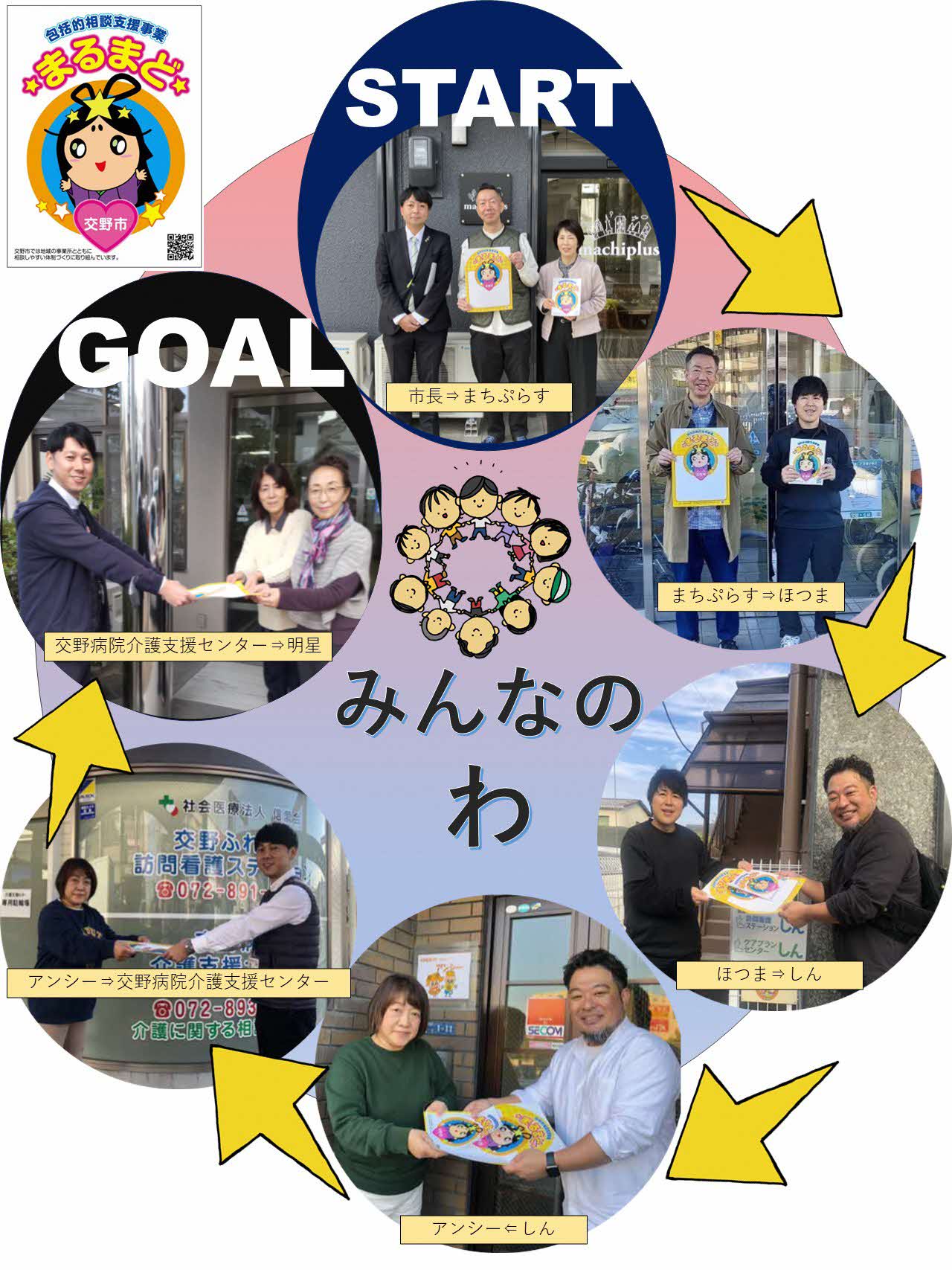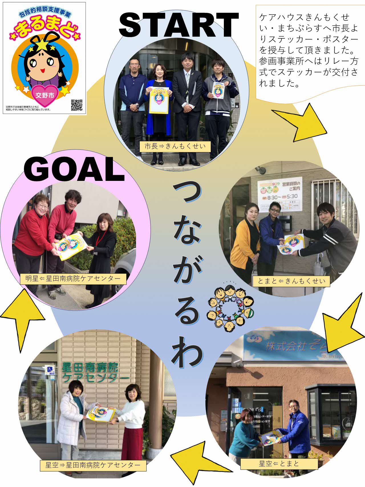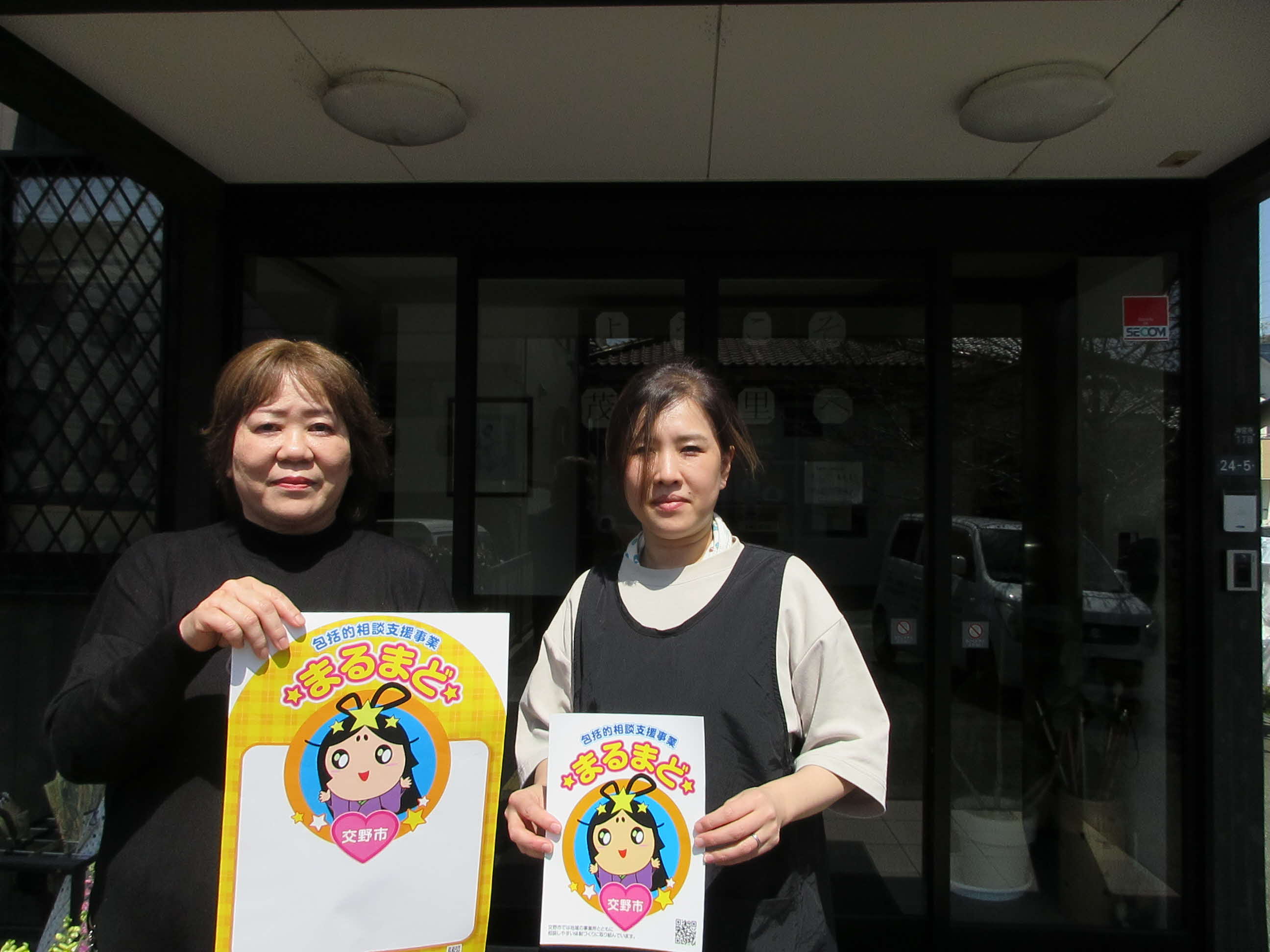 交野市では、行政内での高齢・障がい・子育て・生活困窮等の相談体制に加え、『地域での身近な相談窓口』として福祉・医療職のいる市内ケアプランセンターやデイサービスセンター等の事業所においても、市民からの相談等をいったん受けとめ、適切な関係機関につなげる役割を担う相談窓口『まるまど』を開設しています。