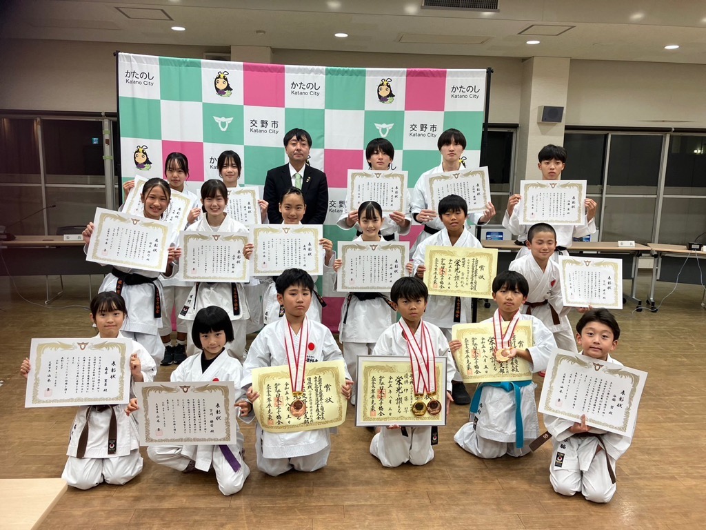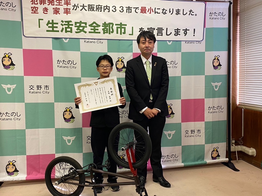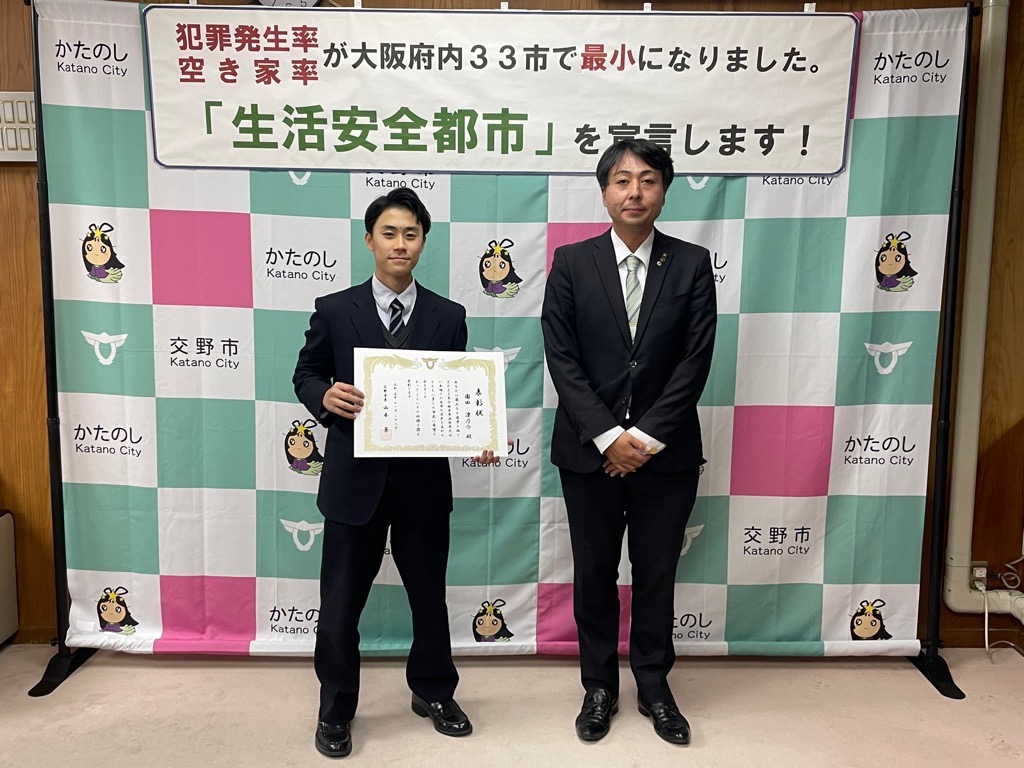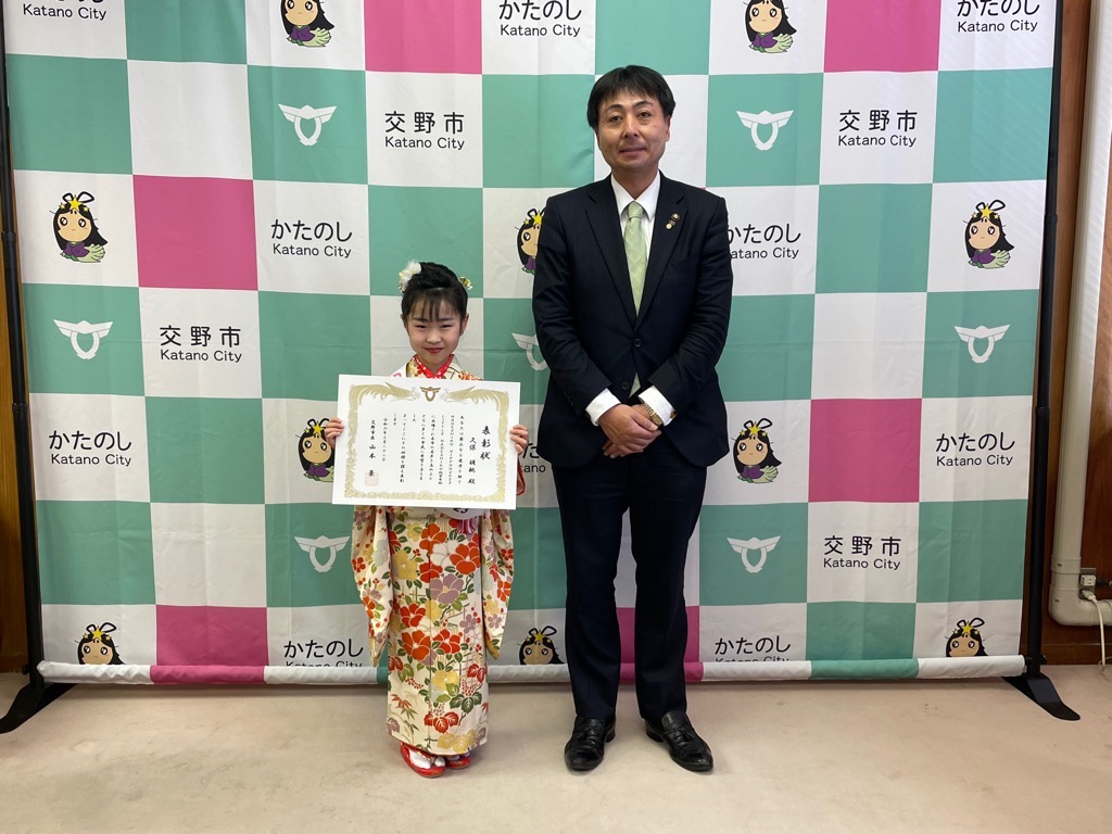 公開日 2024年07月03日 更新日 2025年05月15日 兼松 里実(かねまつ さとみ)さん【妙見坂】/楠田 陽葵(くすだ ひより)さん【星田北】/米丸 茉那(よねまる まな)さん【星田】 【表彰理由】千葉にて開催された第51回バトントワーリング全国大会に出場。 【受賞者からの一言】 兼松 里実さん:全国大会という大きな大会に出れて2位という結果をいただけてとてもうれしかったです! たくさん努力をしてまた全国大会という舞台に立ちたいと思いました! 楠田 陽葵さん:全国大会で2位を取ることができて嬉しかったです。一緒に頑張ったチームメンバー、指導してくださった先生方、支えてくれた家族に感謝の気持ちでいっぱいです。もっと頑張って次は1位を取りたいです。 米丸 茉那さん:バトントワーリング全国大会にて第2位を受賞しました。とてもうれしかったです。でも、1位じゃなかったのがくやしかったです。この良い経験を活かして、これからも努力していきたいです。 松本 明香里(まつもと あかり)さん【郡津】 【表彰理由】静岡にて開催された第27回PIARAピアノコンクール ファイナルジュニアA部門に出場。東京にて開催された第17回ベーテン音楽コンクール全国大会 自由曲コース小学3・4年生の部に出場。 【受賞者からの一言】表彰してもらえてとてもうれしいです。これからもいろいろな曲にチャレンジしてがんばっていきたいと思います。 久保 胡桃(くぼ くるみ)さん【倉治】 【表彰理由】京都にて開催されたNADESHIKO NIPPON2023 LITTLE NADESHIKO 低学年部門に出場し最優秀特別賞を受賞。 【受賞者からの一言】これらの結果はすべて、たくさんの方々の応援・ご協力のおかげです。 なでしこ日本とは、失われていく日本の理想女性像「やまとなでしこ」を日本が誇る『和』を通して発していくコンテストです。 これからも大好きなお着物と日本文化を、たくさんの人に発信していけたらと思います。 ありがとうございました。 末利 義孝(すえとし よしたか)さん【郡津】 【表彰理由】姫路にて開催された第2回ベンチプレス競技日本グランプリ のマスターズ1(40歳~49歳)部門に出場し優勝。 【受賞者からの一言】枚方にある社会医療法人美杉会にて介護職として勤務しながら、日々練習を頑張ってます。仕事とプライベートを両立しやすい環境の為、優勝できたと思います。今後は、アジア大会など代表選手に選ばれるよう頑張ります! 園田 凜乃介(そのだ りんのすけ)さん【私部南】 【表彰事由】2023年少林寺拳法世界大会in Tokyo,Japanに一般男子初段(組演武)の部門にて出場。 【受賞者からの一言】この結果は、先生や相方、部員のみんなや家族、支え、応援してくださった方々がいるおかげで成し遂げられたことです。この感謝の気持ちを忘れずに、一人でも喜んでもらえるよう、今後も邁進していこうと思います。 青山 寛幸(あおやま ひろゆき)さん【梅ケ枝】 【表彰事由】京阪交野線郡津下手踏切内で立ち往生している高齢者女性を救助。 【受賞者からの一言】ニュースで報道されるような事に自分が遭遇するとは思いもしませんでした。救助した女性に怪我は無く、無事にご家族のもとに帰れたと警察の方から教えていただき安心しました。 内藤 圭吾(ないとう けいご)さん【南星台】 【表彰事由】かごしま国民体育大会にテニス競技にて出場。 【受賞者からの一言】立命館守山中学校に通学しております。鹿児島国体に出場しました。盛大な開会式、貴重な経験になりました。生まれ育った交野市で素晴らしい賞を頂き、有難うございます。 伊藤 翠(いとう すい)さん/谷 柚嬉(たに ゆずき)さん/石堂 航輝(いしどう こうき)さん/西村 宗士郎(にしむら そうじろう)さん/伊藤 藍(いとう あい)さん/谷脇 碧(たにわき そら)さん/下川 瑛太(しもかわ えいた)さん/下川 都愛(しもかわ とめ)さん/橋本 彩乃(はしもと あやの)さん/塚本 梓乃(つかもと しの)さん/川端 舞夕(かわばた まゆ)さん/平良 虎太郎(たいら こたろう)/上垣内 優輝(うえがいと ゆうき)さん/沓掛 航大(くつかけ こうた)さん/沓掛 湊人(くつかけ みなと)さん/南野 愛琳(みなみの あいり)さん/上川 遥希(かみかわ はるき)さん/森本 里菜(もりもと りな)さん/森岡 ひかり(もりおか ひかり)さん/山本 陽大(やまもと ひなた)さん/有川 結(ありかわ ゆい)さん【日本空手協会交野青山支部】 【表彰事由】空手道の全国選手権大会に出場。 【受賞者からの一言】今回市長より表彰してもらえてとても嬉しいです。これも師範、先生方が熱心に指導してくれたからだと思います。来年は全国大会3連覇を目指して頑張ります。【伊藤 翠(いとう すい)さんより】 平野 奨貴(ひらの しょうき)さん【私市】 【表彰事由】岡山にて開催された自転車競技の全国大会(全日本BMXフリースタイル選手権)に出場。 【受賞者からの一言】全日本という大きな大会で2位をとれてとても嬉しかったです。もっと上手くなって世界で活躍できるような選手になりたいです。 𠮷坂 泰彦(よしさか やすひこ)さん【私部西