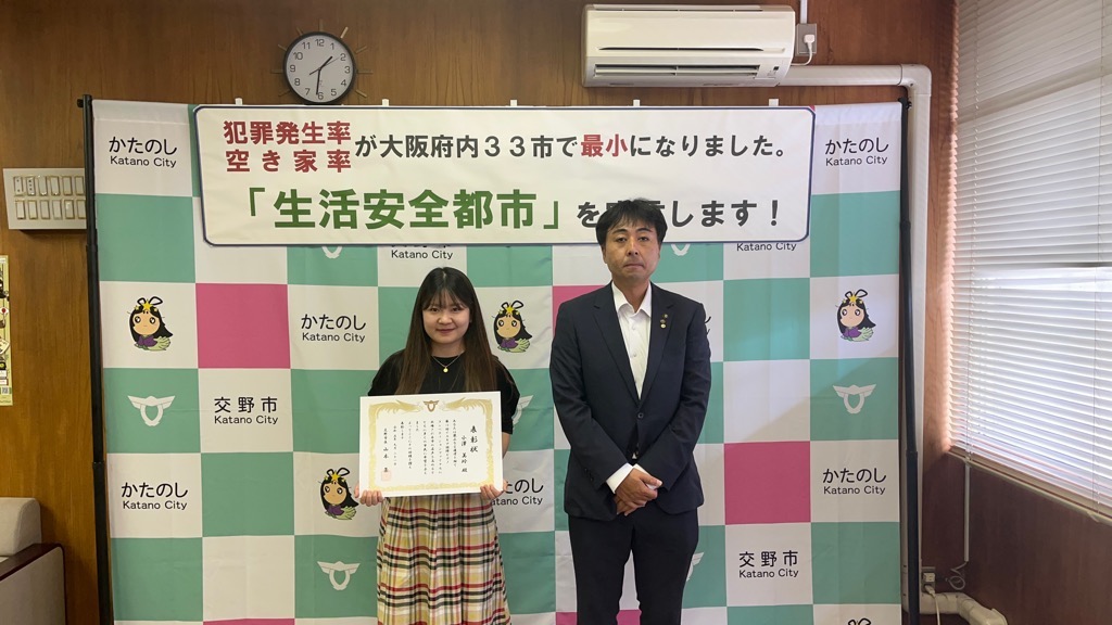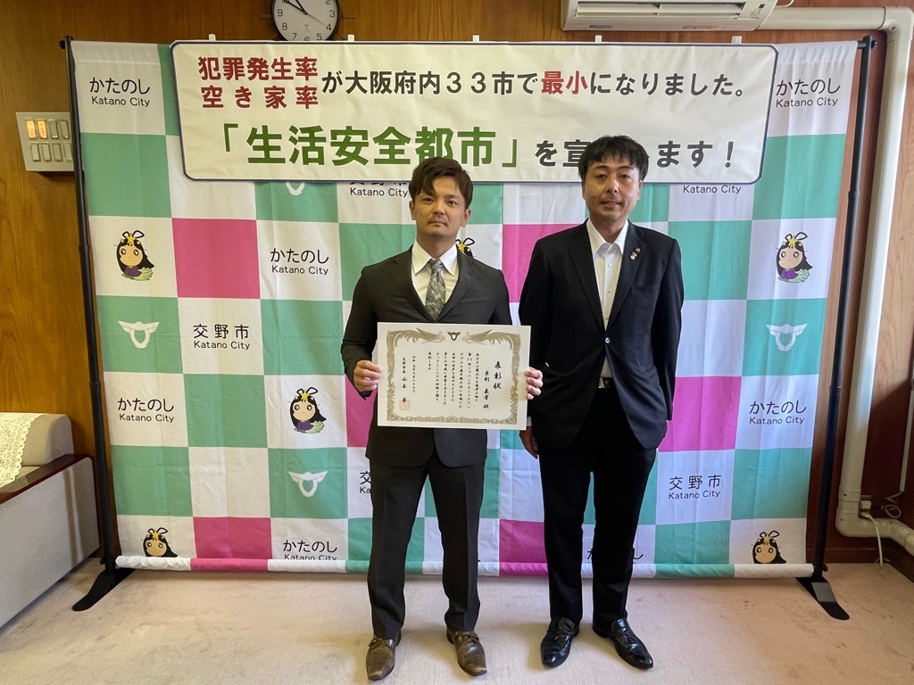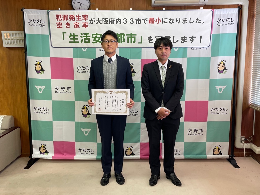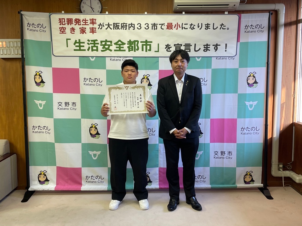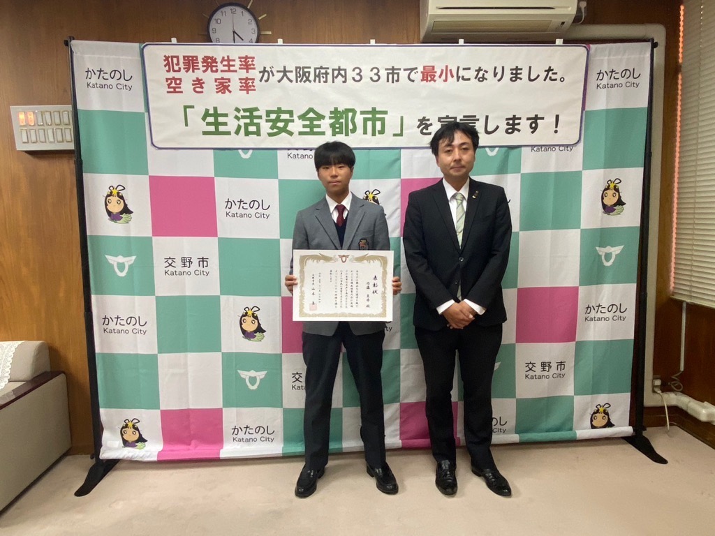 公開日 2024年07月03日 更新日 2025年05月15日 兼松 里実(かねまつ さとみ)さん【妙見坂】/楠田 陽葵(くすだ ひより)さん【星田北】/米丸 茉那(よねまる まな)さん【星田】 【表彰理由】千葉にて開催された第51回バトントワーリング全国大会に出場。 【受賞者からの一言】 兼松 里実さん:全国大会という大きな大会に出れて2位という結果をいただけてとてもうれしかったです! たくさん努力をしてまた全国大会という舞台に立ちたいと思いました! 楠田 陽葵さん:全国大会で2位を取ることができて嬉しかったです。一緒に頑張ったチームメンバー、指導してくださった先生方、支えてくれた家族に感謝の気持ちでいっぱいです。もっと頑張って次は1位を取りたいです。 米丸 茉那さん:バトントワーリング全国大会にて第2位を受賞しました。とてもうれしかったです。でも、1位じゃなかったのがくやしかったです。この良い経験を活かして、これからも努力していきたいです。 松本 明香里(まつもと あかり)さん【郡津】 【表彰理由】静岡にて開催された第27回PIARAピアノコンクール ファイナルジュニアA部門に出場。東京にて開催された第17回ベーテン音楽コンクール全国大会 自由曲コース小学3・4年生の部に出場。 【受賞者からの一言】表彰してもらえてとてもうれしいです。これからもいろいろな曲にチャレンジしてがんばっていきたいと思います。 久保 胡桃(くぼ くるみ)さん【倉治】 【表彰理由】京都にて開催されたNADESHIKO NIPPON2023 LITTLE NADESHIKO 低学年部門に出場し最優秀特別賞を受賞。 【受賞者からの一言】これらの結果はすべて、たくさんの方々の応援・ご協力のおかげです。 なでしこ日本とは、失われていく日本の理想女性像「やまとなでしこ」を日本が誇る『和』を通して発していくコンテストです。 これからも大好きなお着物と日本文化を、たくさんの人に発信していけたらと思います。 ありがとうございました。 末利 義孝(すえとし よしたか)さん【郡津】 【表彰理由】姫路にて開催された第2回ベンチプレス競技日本グランプリ のマスターズ1(40歳~49歳)部門に出場し優勝。 【受賞者からの一言】枚方にある社会医療法人美杉会にて介護職として勤務しながら、日々練習を頑張ってます。仕事とプライベートを両立しやすい環境の為、優勝できたと思います。今後は、アジア大会など代表選手に選ばれるよう頑張ります! 園田 凜乃介(そのだ りんのすけ)さん【私部南】 【表彰事由】2023年少林寺拳法世界大会in Tokyo,Japanに一般男子初段(組演武)の部門にて出場。 【受賞者からの一言】この結果は、先生や相方、部員のみんなや家族、支え、応援してくださった方々がいるおかげで成し遂げられたことです。この感謝の気持ちを忘れずに、一人でも喜んでもらえるよう、今後も邁進していこうと思います。 青山 寛幸(あおやま ひろゆき)さん【梅ケ枝】 【表彰事由】京阪交野線郡津下手踏切内で立ち往生している高齢者女性を救助。 【受賞者からの一言】ニュースで報道されるような事に自分が遭遇するとは思いもしませんでした。救助した女性に怪我は無く、無事にご家族のもとに帰れたと警察の方から教えていただき安心しました。 内藤 圭吾(ないとう けいご)さん【南星台】 【表彰事由】かごしま国民体育大会にテニス競技にて出場。 【受賞者からの一言】立命館守山中学校に通学しております。鹿児島国体に出場しました。盛大な開会式、貴重な経験になりました。生まれ育った交野市で素晴らしい賞を頂き、有難うございます。 伊藤 翠(いとう すい)さん/谷 柚嬉(たに ゆずき)さん/石堂 航輝(いしどう こうき)さん/西村 宗士郎(にしむら そうじろう)さん/伊藤 藍(いとう あい)さん/谷脇 碧(たにわき そら)さん/下川 瑛太(しもかわ えいた)さん/下川 都愛(しもかわ とめ)さん/橋本 彩乃(はしもと あやの)さん/塚本 梓乃(つかもと しの)さん/川端 舞夕(かわばた まゆ)さん/平良 虎太郎(たいら こたろう)/上垣内 優輝(うえがいと ゆうき)さん/沓掛 航大(くつかけ こうた)さん/沓掛 湊人(くつかけ みなと)さん/南野 愛琳(みなみの あいり)さん/上川 遥希(かみかわ はるき)さん/森本 里菜(もりもと りな)さん/森岡 ひかり(もりおか ひかり)さん/山本 陽大(やまもと ひなた)さん/有川 結(ありかわ ゆい)さん【日本空手協会交野青山支部】 【表彰事由】空手道の全国選手権大会に出場。 【受賞者からの一言】今回市長より表彰してもらえてとても嬉しいです。これも師範、先生方が熱心に指導してくれたからだと思います。来年は全国大会3連覇を目指して頑張ります。【伊藤 翠(いとう すい)さんより】 平野 奨貴(ひらの しょうき)さん【私市】 【表彰事由】岡山にて開催された自転車競技の全国大会(全日本BMXフリースタイル選手権)に出場。 【受賞者からの一言】全日本という大きな大会で2位をとれてとても嬉しかったです。もっと上手くなって世界で活躍できるような選手になりたいです。 𠮷坂 泰彦(よしさか やすひこ)さん【私部西