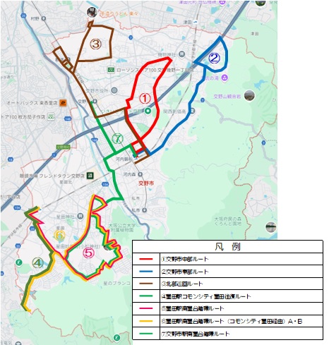 ※現在運行中の「交野市北部巡回バス実証運行「おりひめバス」」については令和7年4月1日より下記「③北部巡回ルート」として運行内容を変更し継続いたします。