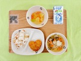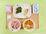 ・ごま入り鮭菜飯 ・新玉ねぎのすまし汁 ・野菜しんじょう ・じゃがいもの土佐煮風 ・牛乳 |