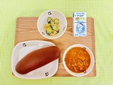 ・黒糖丸パン ・ベジタスープ ・鮭フライ ・ハムとキャベツのサラダ ・ノンエッグタルタルソース ・牛乳 |