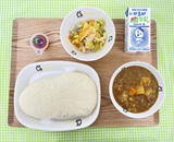 ・ナン ・ビーフカレー ・野菜ソテー ・ミニぶどうゼリー ・牛乳 |
