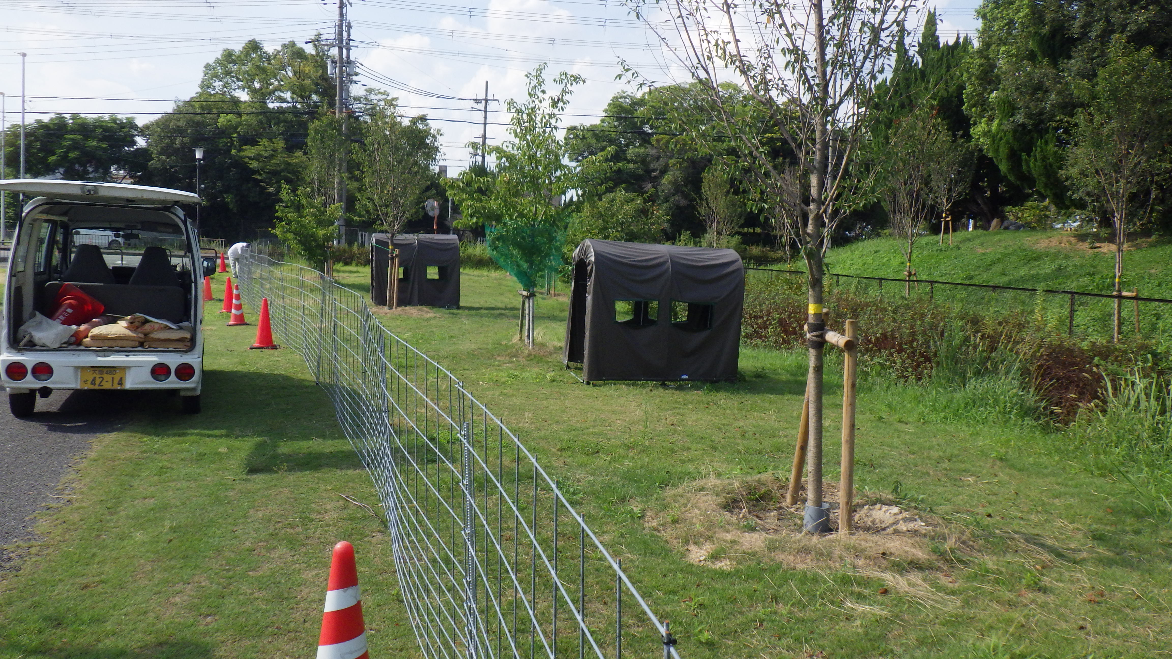 仮設フェンス内でヤギ2頭を放牧していますので、見学の際は、ヤギにエサを与えたり驚かせたりせず、フェンス外からの観察にご協力をお願いいたします。