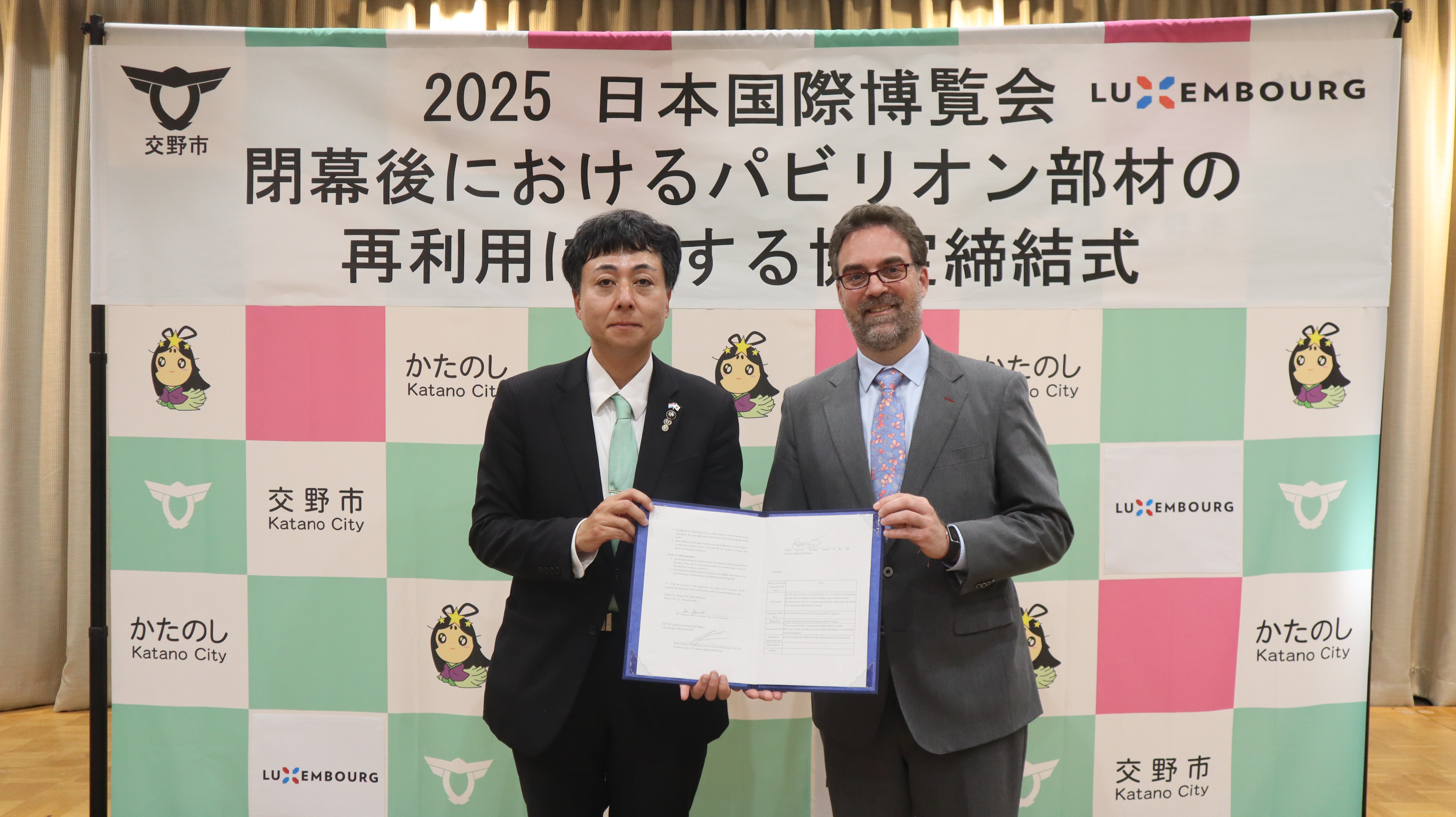 交野市は、令和7年11月12日(水)、2025大阪万博ルクセンブルク経済利益団体(GIE)※と、海外パビリオン部材の再利用に関する協定を締結しました。