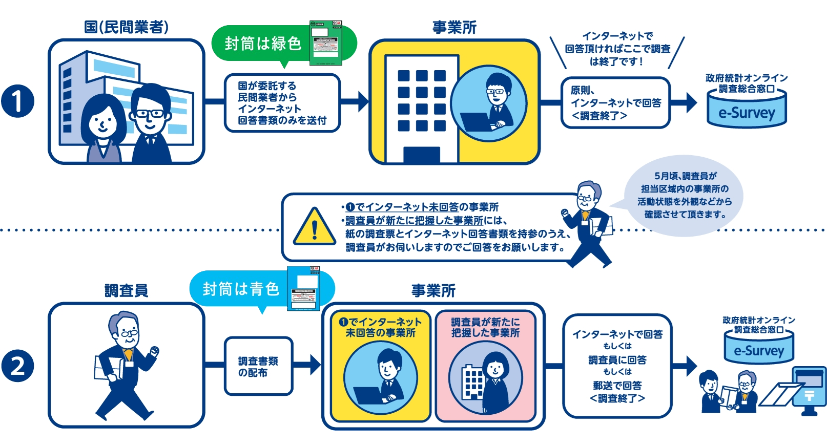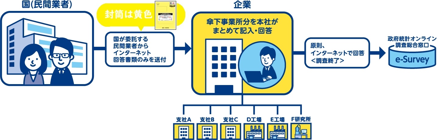 インターネット回答を基本とし、令和8年5月頃に国(民間調査会社)から、本社、本所などにインターネット回答用の書類が郵送されます。